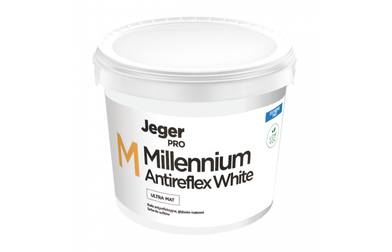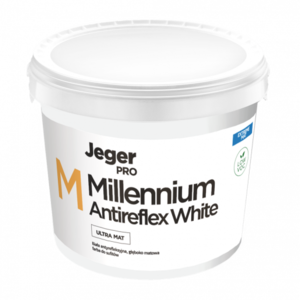 Jeger Millennium Antireflex White Ultra Matt е висококачествена, ултраматова боя за тавани. Характеризира се с висока покривност и ефективност. Новата формула, която не разпръсква, осигурява комфортно боядисване. Създава устойчиво на триене, хомогенно антирефлексно покритие. Ниското съдържание на летливи органични съединения (ЛОС) прави този продукт екологичен и безопасен за хората.