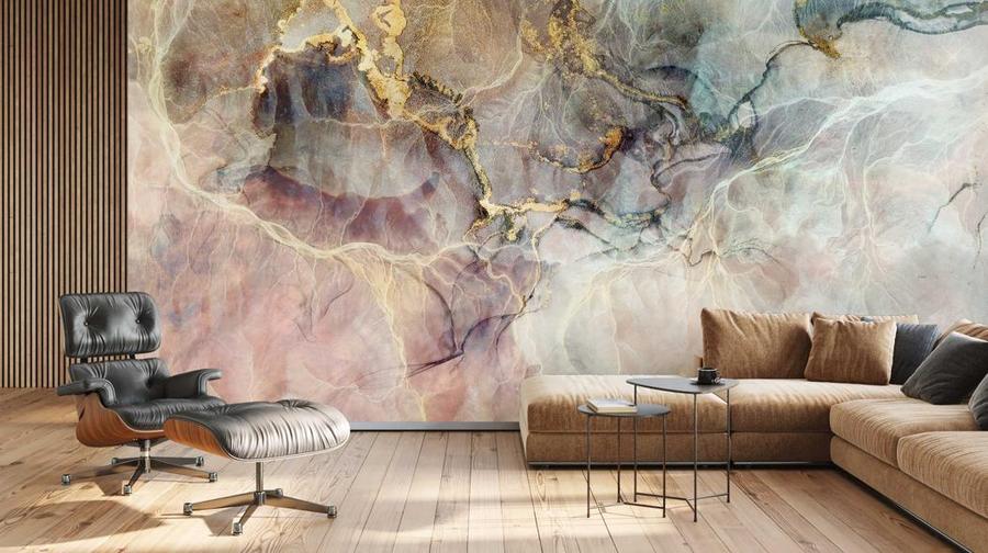 Висококачествен тапет с абстрактен мотив в приглушени цветове с нотка златист цвят - изработен с помощта на екологична технология за печат на тапети