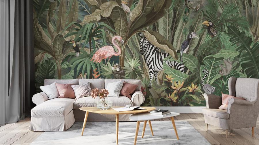 Висококачествен тапет с мотива на джунглата в ярки цветове – изработен с помощта на екологична технология за печат на тапети