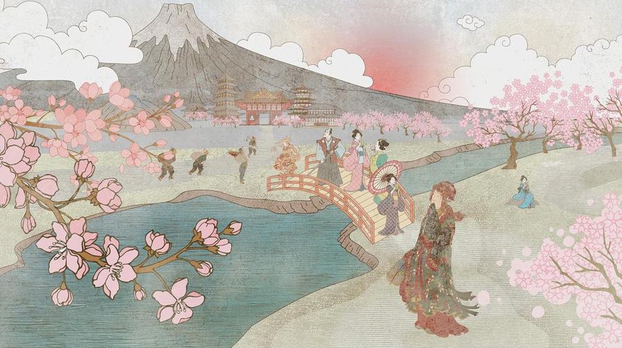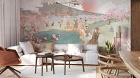 Този тапет е с мотива на най-високата планина в Япония, Fuji, която е и вулкан. Фуджи пленява с богато детайлния си дизайн и приглушената си цветова палитра от сиво, светло зелено и розово. Вниманието е привлечено от фигури, облечени в богато украсени, традиционни японски кимона, и емблематичния японски символ - розови черешови цветове. Този дизайн е наслада за гледане с часове! Той допълва класически, еклектични и японски интериори , както и такива с естествени материали.