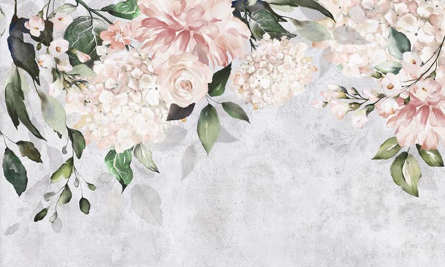 Тапет по поръчка с големи цветя и листа, светъл бетон – изработен с помощта на екологична технология за печат на тапети