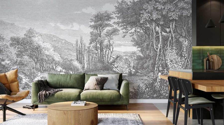 Landscape - пейзажен тапет, във вечна черно-сива цветова схема, напомня за сложно изработена скица или дърворезба. Рисунката пленява с вниманието си към детайла и начина, по който изобразява дребните детайли. Можете да се потопите в тази гледка, откривайки нови детайли всеки път. Като декорирате стената си с пейзажен тапет , ще постигнете зашеметяващ ефект, създавайки перфектния фон за показване на мебели и предмети в смели цветове.