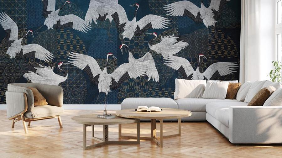 Впечатляващ тапет с японския мотив Orizuru, или хартиен жерав – един от най-известните и класически дизайни на японско оригами. Дизайнът на тапета Orizuru е изграден на принципа на привличащия вниманието контраст. Тъмният, тъмносиният фон е мозайка от квадрати, на някои места покрити с античен златен принт . Отличителният силует на големите, величествени бели жерави се откроява на фона на дълбочината на тъмносиньото. Тази комбинация ще добави непринудена елегантност към всяко пространство – перфектно допълнение към модерен, класически, японски , бляскав и винтидж интериор . Orizuru ще бъде идеален за хол или спалня.