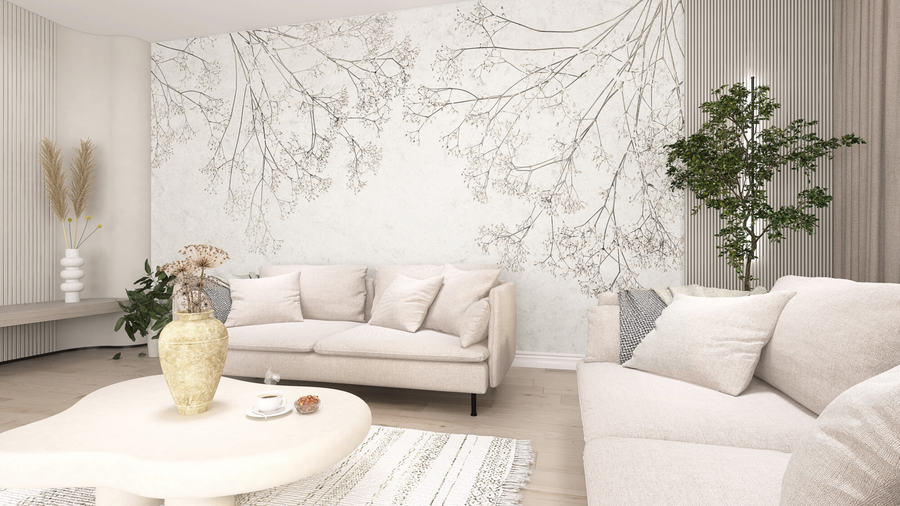 Висококачествен фототапет с минималистичен мотив от пролетни клонки – изработен с помощта на екологична технология за печат на тапети