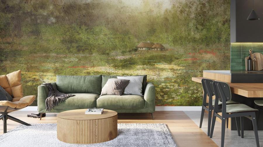 Idylická atmosféra tapety Cottage vás uchvátí svou krásou a všeobjímající paletou zeleně. Možná si v něm všimnete lesa, louky, lesního jezírka – vše záleží na vás. Chata je hypnotizující a umožňuje hluboce relaxovat, zklidnit myšlenky – pomáhá při cvičením jógy a uklidňuje myšlenky. Pozornost je upoutána na malý domek, symbolizující pocit bezpečí – útočiště v rozlehlém prostoru. Použitý materiál, s nepravidelnou strukturou skutečného betonu, zesiluje nerovnoměrný abrazivní účinek povrchu. Cottage v kombinaci s měkkou sedací soupravou a dřevěným nábytkem vám pomůže vytvořit výjimečně útulný, domácký interiér.