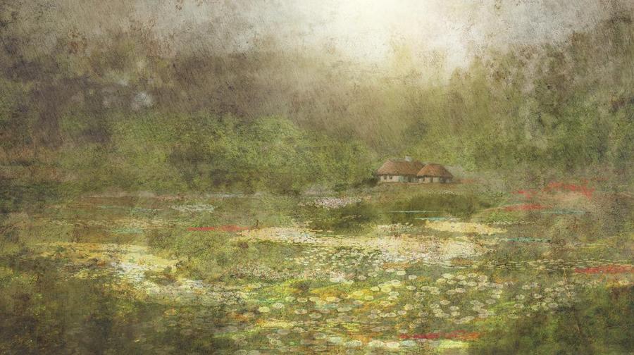 Kvalitní tapeta s idylickou krajinou s motivem domu – vyrobená ekologickou technologií tisku tapet