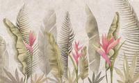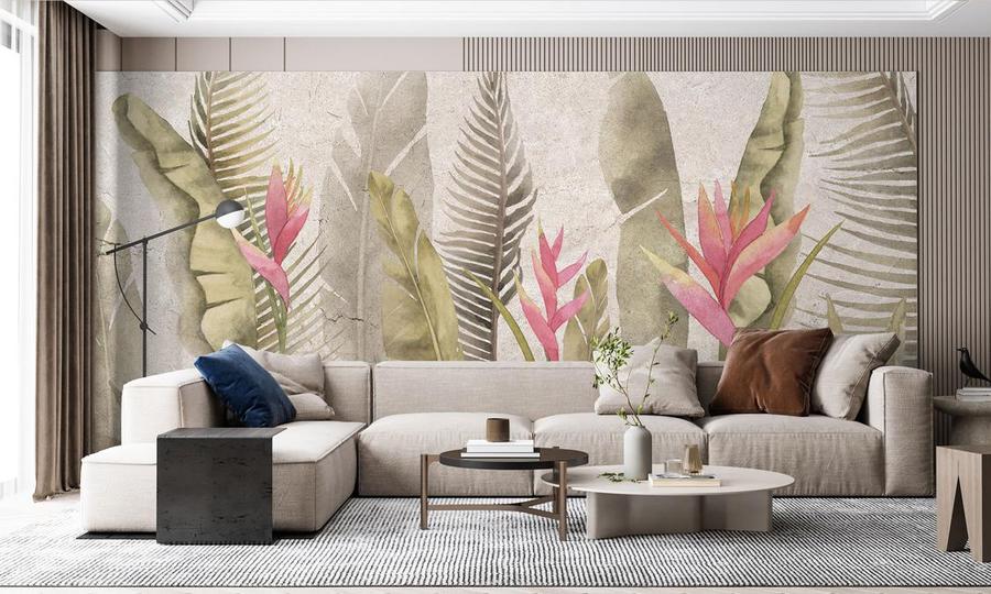 Zakázkové tapety velké zelené listy a květy, teplé tóny – vyrobené pomocí technologie tisku tapet šetrné k životnímu prostředí