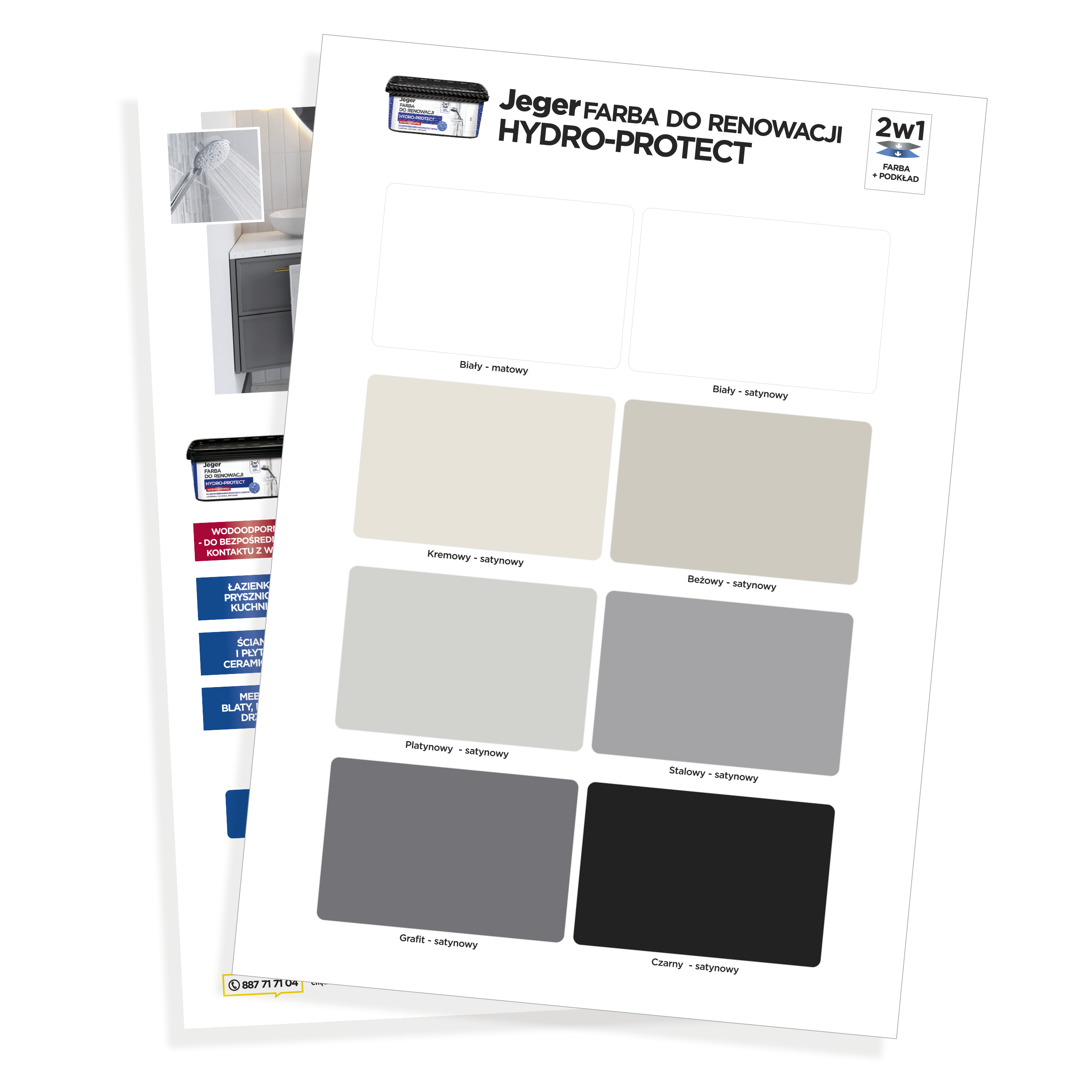 Jeger Hydro-Protect wasserfeste Renovierungsfarbe - Musterset präsentiert reale Farbmuster, die mit authentischen Produkten und nicht mit aufgedruckten Grafiken hergestellt wurden. So können Sie die tatsächliche Struktur, den Glanz und die Tiefe der Oberfläche sehen, die Sie nach der Renovierung von besonders wassergefährdeten Bereichen – in Badezimmern oder Küchen – erhalten.
