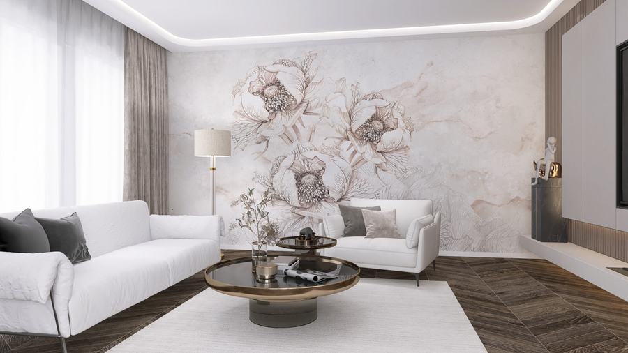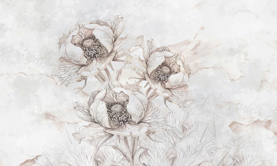 Die Tapete Amara ist eine Kombination aus einer subtilen botanischen Zeichnung und einem zarten Hintergrund, der von der Textur von Marmor inspiriert ist und eine elegante und romantische Komposition bildet. Handgezeichnete Blumen in gedeckten Beige- und Grautönen verleihen dem Innenraum Leichtigkeit und einen künstlerischen Charakter. Es ist die perfekte Wahl für Liebhaber der Natur und der klassischen Ästhetik in moderner Interpretation.
