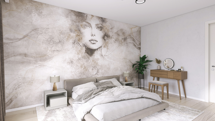 Tapete Essence in Grautönen, mit einem subtilen Hintergrund, wird eine einzigartige Dekoration Ihres Interieurs sein. Ein weibliches Gesicht mit zarten Zügen, das im Mittelpunkt der Komposition steht, verleiht dem Raum Charme und Geheimnis. Dieses Muster passt perfekt zu verschiedenen Einrichtungsstilen und verleiht ihnen Eleganz und Raffinesse. Es passt perfekt zum modernen Minimalismus - dank seiner Schlichtheit und Zartheit schafft es eine harmonische und ruhige Raumatmosphäre. Industrielle Ästhetik - die Grautöne und der rauchige Hintergrund ergänzen perfekt rohe Designelemente wie Metall, Beton oder Ziegel. Essence passt auch perfekt zu Dekorationen im eklektischen und glamourösen Stil.