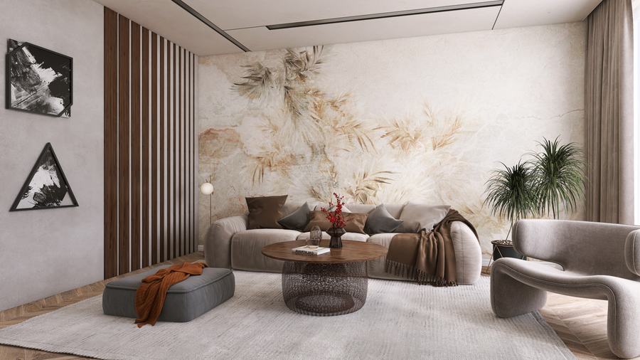 Die Tapete Petal ist eine zarte Komposition, inspiriert von der subtilen Bewegung von Palmblättern, gehalten in sanften Beige-, Creme- und Grautönen. Ihre luftige Form verleiht dem Innenraum Leichtigkeit, Ruhe und einen Hauch von Exotik in eleganter Ausführung. Sie eignet sich ideal für Schlafzimmer, Wohnzimmer oder Arbeitszimmer und schafft einen harmonischen und entspannenden Raum.