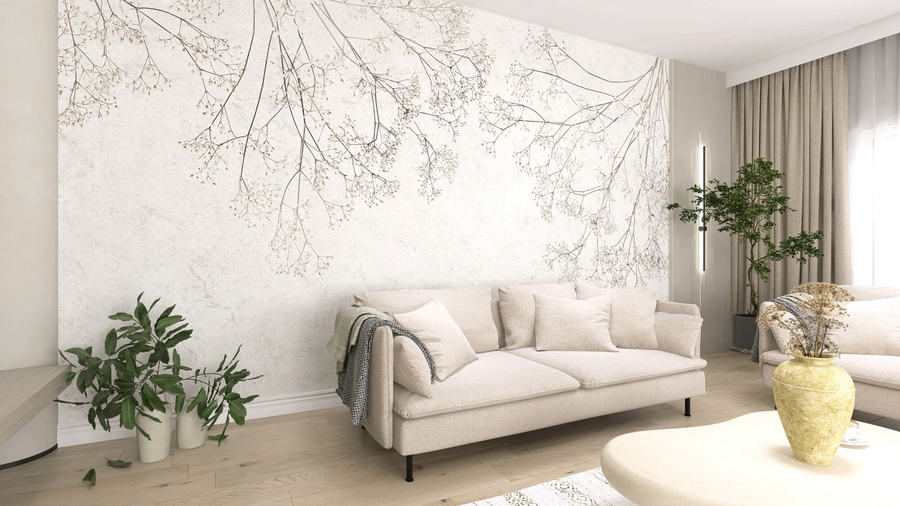 Hochwertige Tapete mit minimalistischem Muster aus Frühlingszweigen – hergestellt mit umweltfreundlicher Tapetendrucktechnologie
