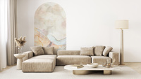 Abstraktes Muster Alpa, evoziert das Nebeneinander der Elemente Erde, Wasser und Luft, die auf einem Material mit Betonstruktur erstaunlich wirken. Unbestimmte Formen verschmelzen miteinander und erinnern an zarte Seide, die von einem leichten Wind bewegt wird. Die Verflechtung von gedeckten Farben erzeugt einen erstaunlichen Farbeffekt. Das Motiv ist dynamisch und bringt Frische und Energie in den Innenraum. Die hellen, leuchtenden Farben lassen selbst einen kleinen Raum optisch größer erscheinen. Alpa wird eine großartige Kulisse für Holzmöbel und Accessoires aus natürlichen Materialien sein.