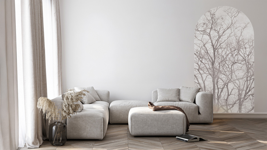 Die Tapete Arbor versetzt Sie in einen geheimnisvollen Winterwald, wo kahle Äste aus dem zarten Nebel hervortreten. Die monochrome Farbpalette in warmen Tönen und die subtilen Farbübergänge verleihen dem Raum Ruhe, Tiefe und eleganten Minimalismus. Es ist das perfekte Angebot für Liebhaber der Natur und moderner Einrichtungen mit einem Hauch von Nostalgie.