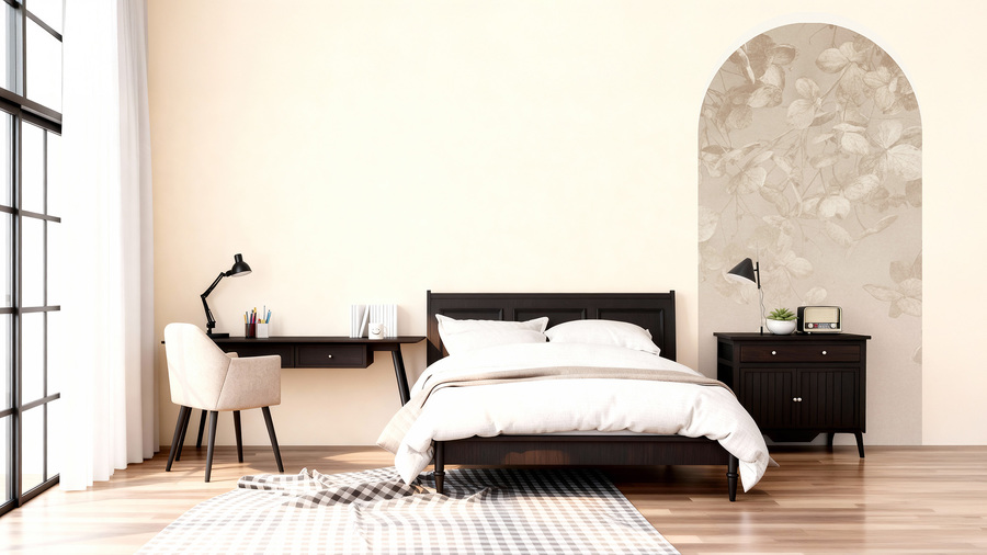 Hochwertige Tapete mit Bogenmuster in warmen Beigetönen und Pflanzenmotiv – hergestellt mit umweltfreundlicher Tapetendrucktechnologie