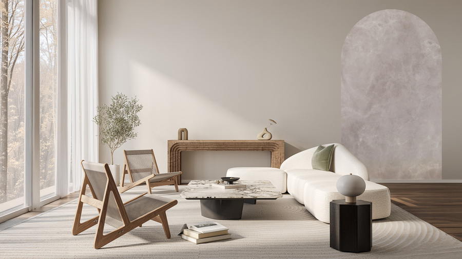 Hochwertige Bogentapete mit dezentem Muster, das an Naturstein erinnert – hergestellt mit umweltfreundlicher Tapetendrucktechnologie