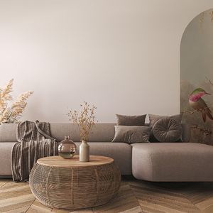 Schließen Sie die Augen und versetzen Sie sich in eine magische Welt fantastischer, riesiger Blumen mit bunten Blütenkelchen und Vögeln mit farbenfrohen Federn. Die Atmosphäre eines tropischen Waldes in malerischer Form fördert die Entspannung und bringt Inspiration und Anregung beim Arbeiten. Der ungleichmäßig schattierte graue Hintergrund eröffnet zusätzlichen Raum und verleiht der märchenhaften Landschaft einen Hauch von Leben. Tapete Magic schafft eine einzigartige Komposition mit Möbeln und Accessoires in Grautönen und dunklem, aber intensivem Grün. Ein solch gemütliches Interieur wird eine echte Oase sein, in der Sie sich an den langen Herbstabenden gerne niederlassen werden.
