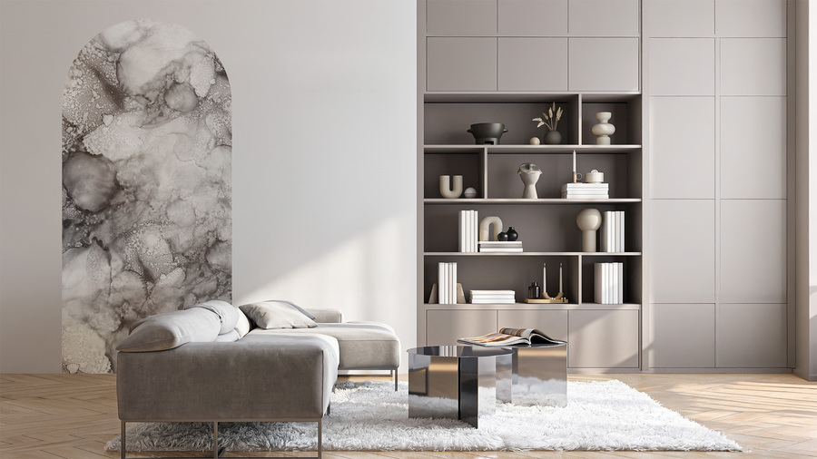 Hochwertige Bogentapete mit abstraktem Muster aus Wolken und mineralischen Strukturen – hergestellt mit umweltfreundlicher Tapetendrucktechnologie