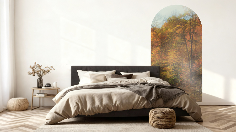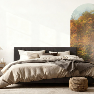 Hochwertige Bogentapete mit einem Motiv eines herbstlichen Waldes am Seeufer – hergestellt mit umweltfreundlicher Tapetendrucktechnologie