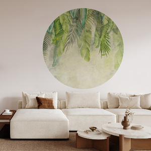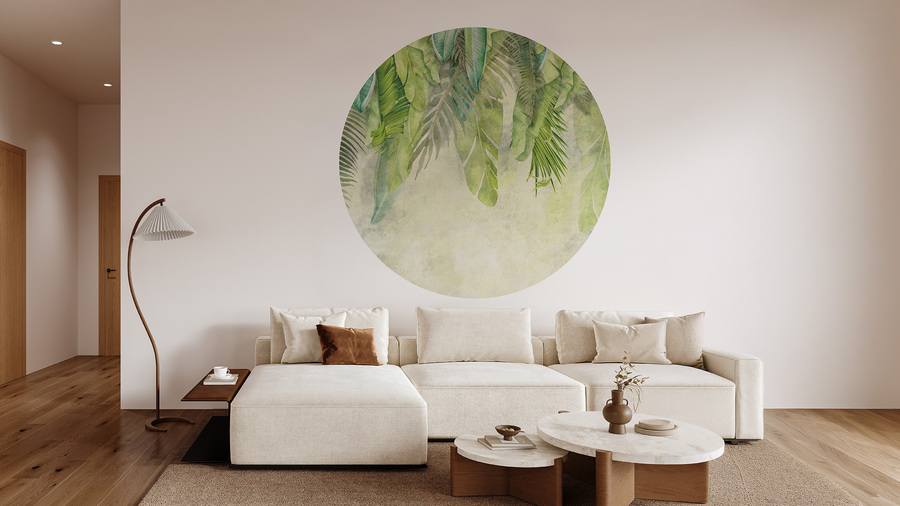 Hochwertige Tapete Kreis mit einem energiegeladenen Muster aus großen, grünen Blättern – hergestellt mit umweltfreundlicher Tapetendrucktechnologie