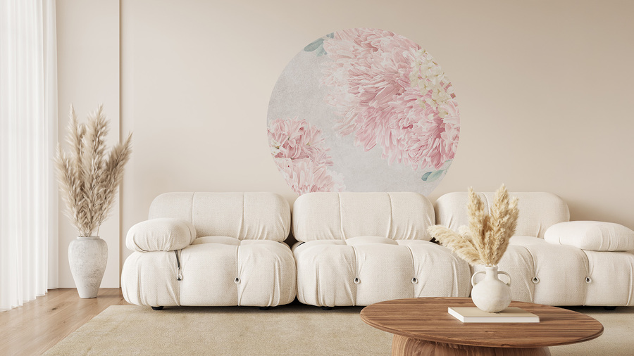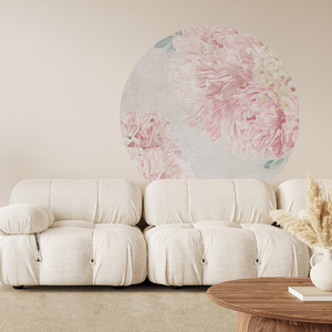Hochwertige Tapete Kreis mit einem Motiv aus zarten, rosa Blumen – hergestellt mit umweltfreundlicher Tapetendrucktechnologie
