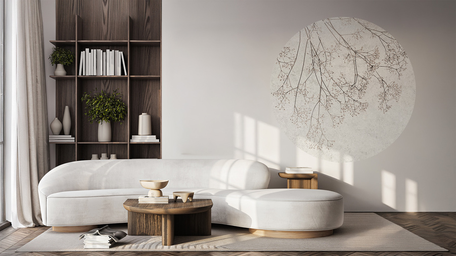 Hochwertige Tapete Kreis mit minimalistischem Muster aus Frühlingszweigen – hergestellt mit umweltfreundlicher Tapetendrucktechnologie