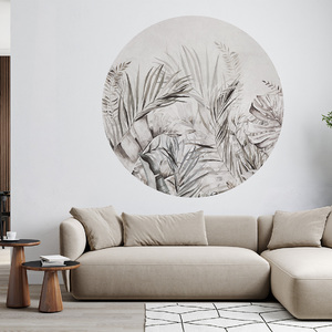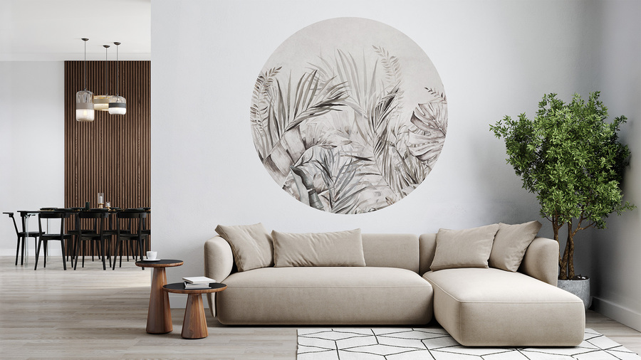 Hochwertige Tapete Kreis mit einem dezenten tropischen Blattmotiv – hergestellt mit umweltfreundlicher Tapetendrucktechnologie