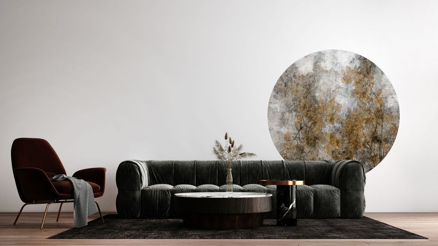 Hochwertige Tapete Kreis mit einem Motiv aus zarten Zweigen in herbstlichen Farben – hergestellt mit umweltfreundlicher Tapetendrucktechnologie