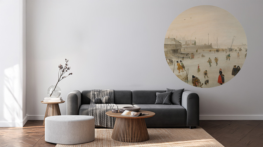 Tapete Winter, dessen Design von holländischen Gemälden des 16. Jahrhunderts inspiriert ist, wird eine schöne Dekoration für jeden Raum sein. Die Winterlandschaft bringt Ruhe in den Innenraum und verleiht ihm einen künstlerischen Touch. Die Genreszene in winterlicher Atmosphäre ist in einer gebleichten Farbgebung gehalten, wobei nur die Figuren im Vordergrund klar definierte Formen und eindeutigere, aber natürliche Farben haben. Die Malerhaftigkeit des Bildes wird durch die Kombination mit dem leinwandartigen Material noch verstärkt. Die Tapete erweckt den Eindruck eines großen Gemäldes und ist eine perfekte Dekoration für klassische und moderne Innenräume.