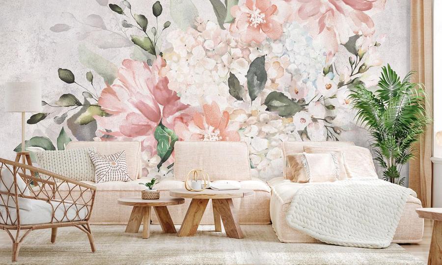 Tapetas pagal užsakymą – didelės pastelinės gėlės, šviesus betonas – pagamintas ekologiška spausdinimo technologija