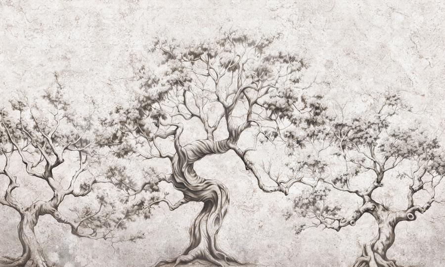 Aukštos kokybės fototapetas su meniniu senų, susisukusių medžių piešiniu – pagamintas ekologiška spausdinimo technologija