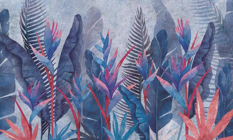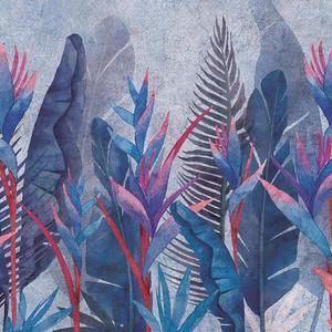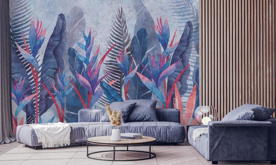 Tapetas pagal užsakymą – dideli mėlyni lapai ir energingos gėlės – pagamintas ekologiška spausdinimo technologija