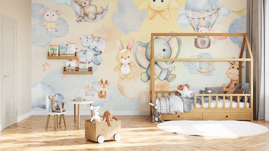 Spalvingas tapetas su dangaus ir gyvūnėlių piešiniu – pagamintas ekologiška spausdinimo technologija