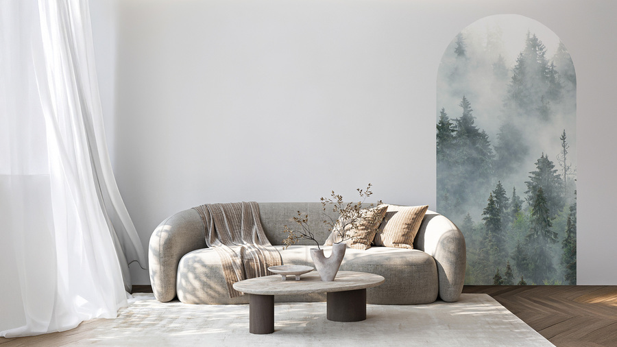 High-quality arch wallpaper with a misty forest motif – made using eco-friendly wallpaper printing technology