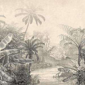 A fascinating pattern of lush vegetation like a woodcut depicts an unusual landscape with tropical trees. Rich, realistic details and earthy colors, brightened by warm light, build an atmosphere of coziness in the interior. Wallpaper scenery Woodcut will fit perfectly into the atmosphere of jungle, boho or biophilic design clothing style, but will also be a great wall decoration in uncluttered, minimalist interiors decorated with love for nature.