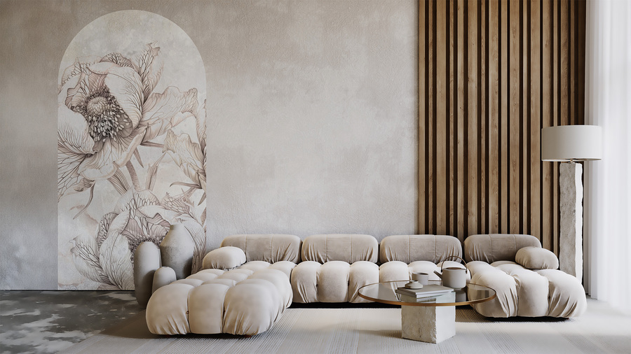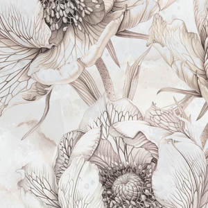 Wallpaper Amara this combination of subtle botanical drawings and a delicate background inspired by the texture of marble creates an elegant and romantic composition. Hand-sketched flowers in muted beiges and grays add lightness and artistic character to the interior. It is an excellent choice for lovers of nature and classic aesthetics with a modern twist.
