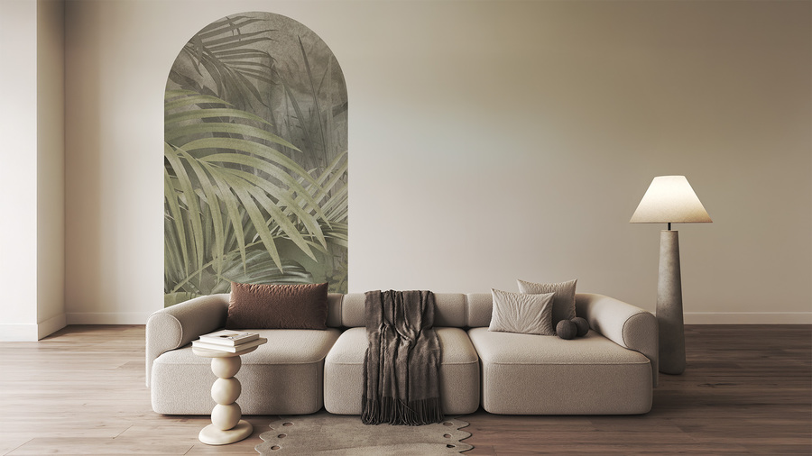 High-quality wallpaper with an arch pattern featuring exotic plants – produced using eco-friendly wallpaper printing technology.