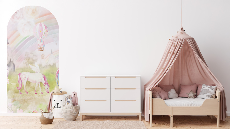 High-quality custom-made arch wallpaper decorated with a drawing of a unicorn land – made using eco-friendly wallpaper printing technology