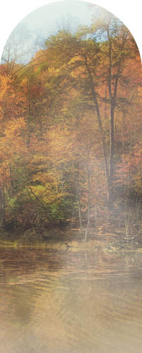 High-quality arch wallpaper with an autumn forest motif on the shore of a lake – made using eco-friendly wallpaper printing technology