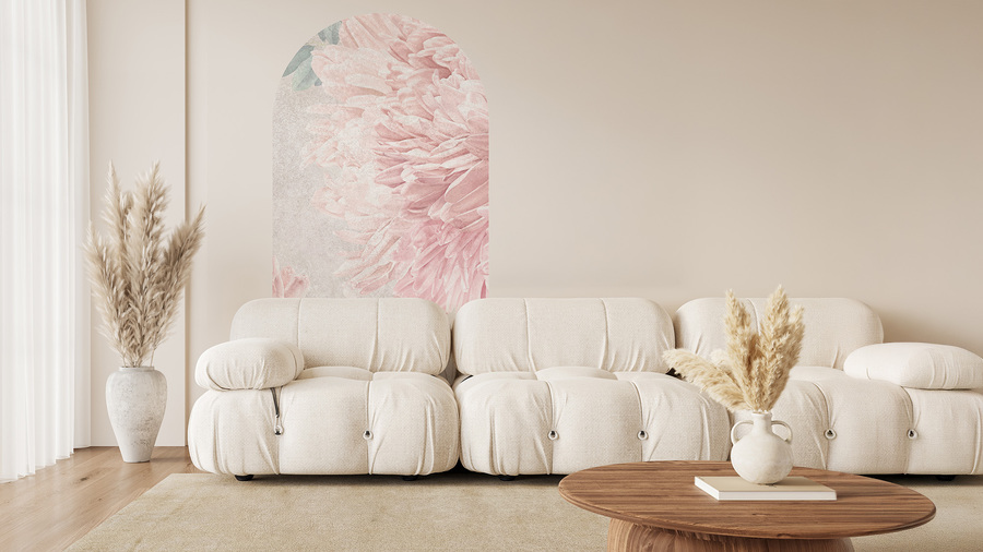 High-quality arch wallpaper with a delicate pink floral motif – produced using eco-friendly wallpaper printing technology