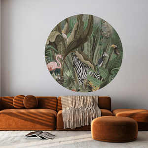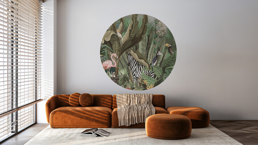 High-quality circle wallpaper with a jungle pattern in vibrant colors – made using eco-friendly wallpaper printing technology