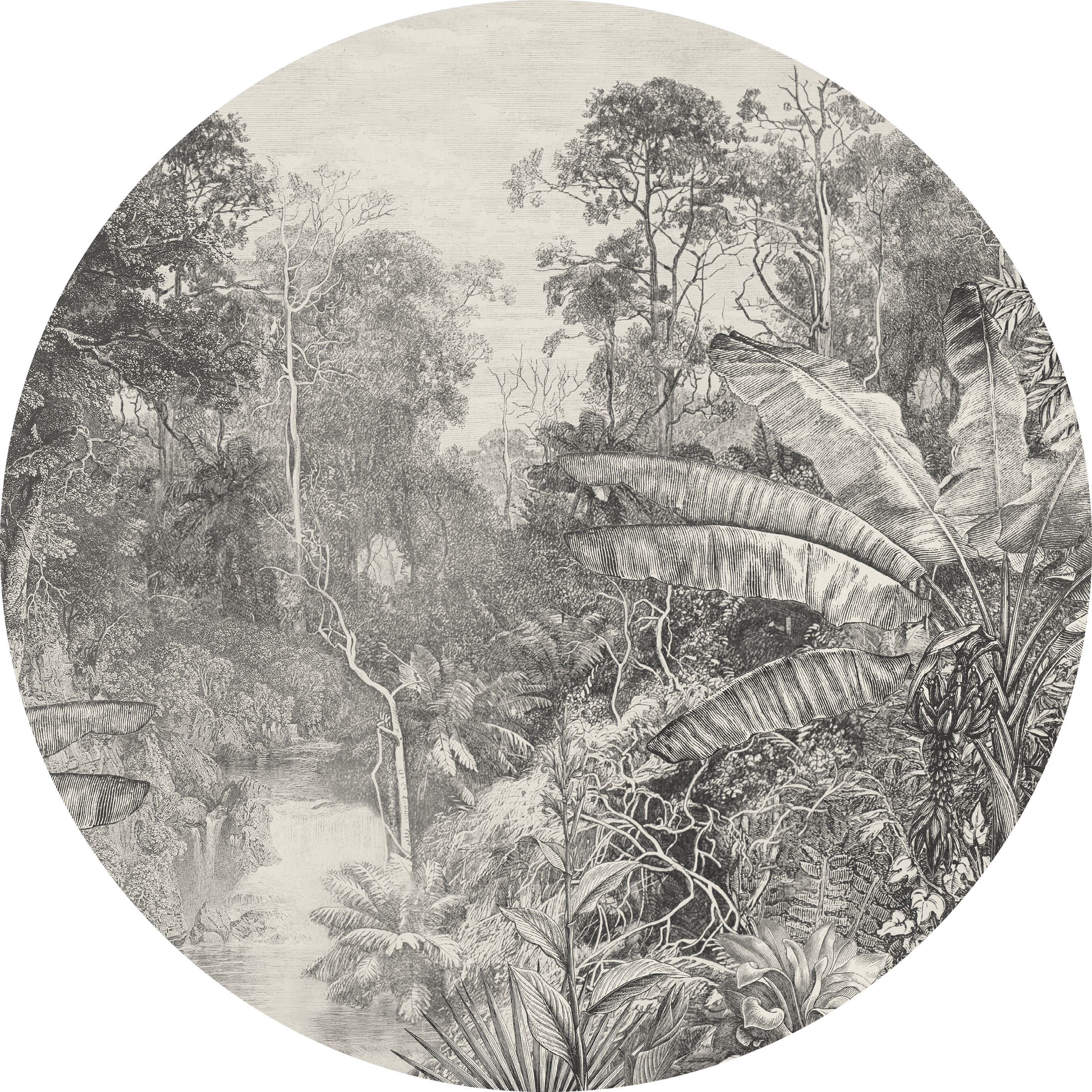 High-quality circle wallpaper with an exotic plant motif in gray colors – made using eco-friendly wallpaper printing technology.