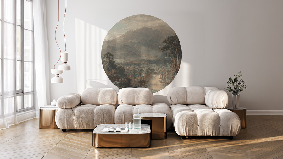 High-quality circle wallpaper with a landscape of the Jura Mountains – made using eco-friendly wallpaper printing technology