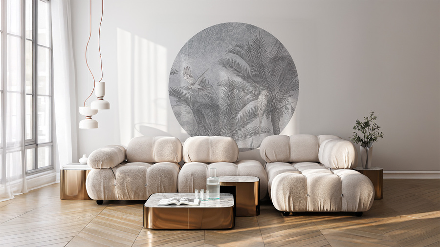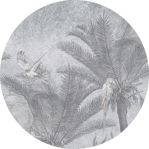 High-quality circle wallpaper with a jungle motif in gray colors – made using eco-friendly wallpaper printing technology