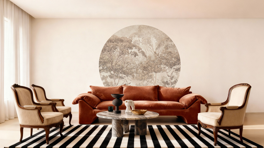 High-quality circle wallpaper with a picturesque pine forest pattern – made using eco-friendly wallpaper printing technology