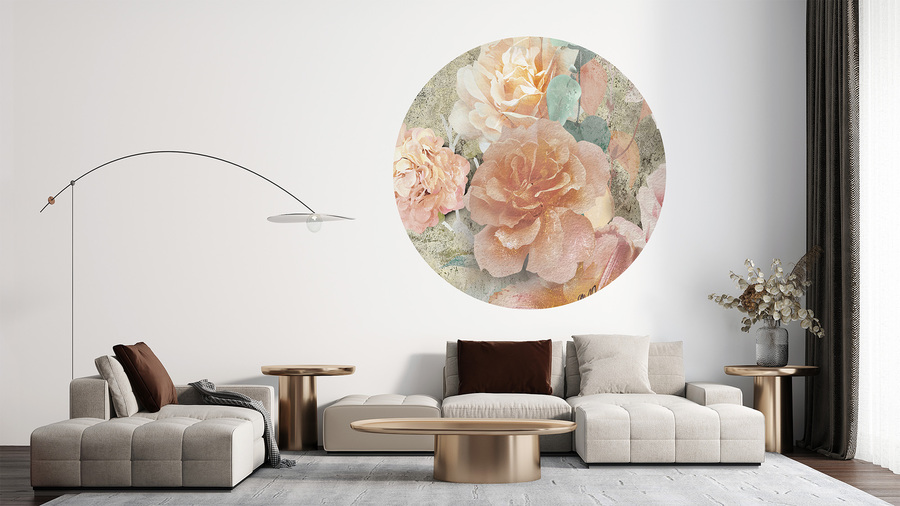 High-quality circle wallpaper with a subtle rose pattern in pastel colors – made using eco-friendly wallpaper printing technology.