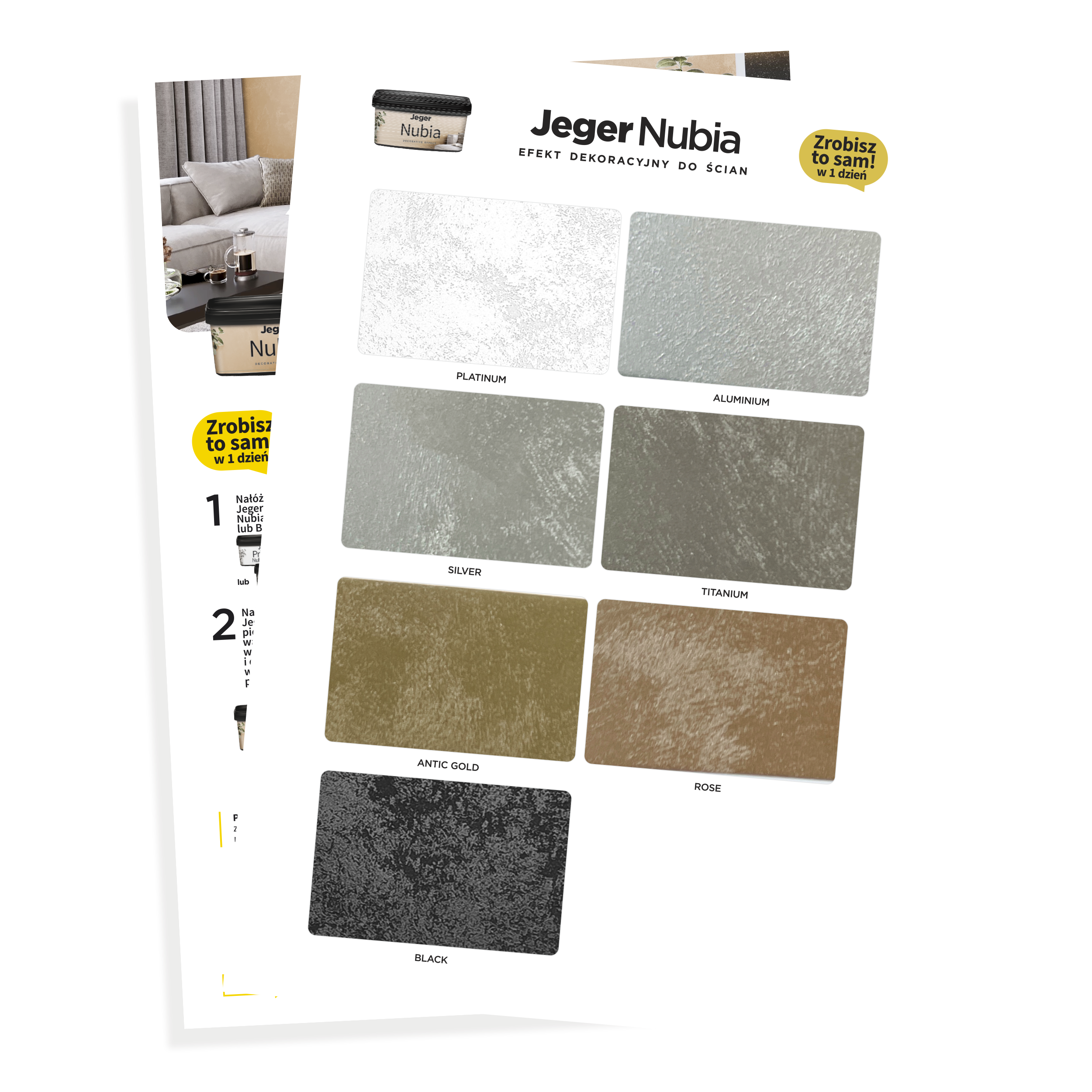 Jeger Nubia - vzorkovník predstavuje reálne vzorky dekoratívneho efektu vyrobené s použitím autentických materiálov, nie potlačených grafík. Vďaka tomu môžete vidieť skutočnú štruktúru, lesk a hĺbku povrchovej úpravy, ktorú dosiahnete vo svojom interiéri.